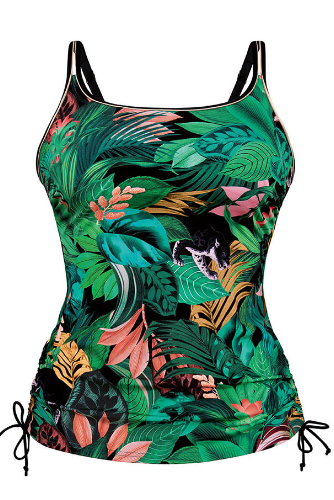 Emerald green care* tankini with tropical patterns, side drawstrings for a slight adjustment. Adjustable straps.