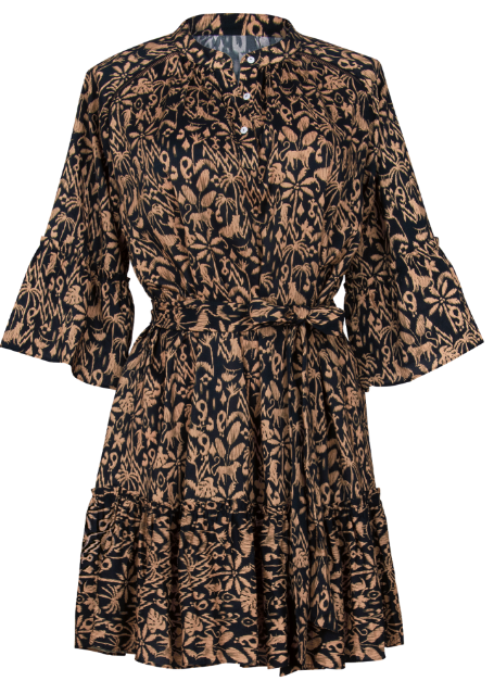 Secret Jungle Sahara Tunic Beach Dress by Anita Rosa Faia. Elegant ladies summer tunic made from lightweight fabric perfect for beach walks. In a modern jungle inspired monochrome print trending this season. The Sahara cover up comes in a flowing shape with delicate ruffles on the sleeves and to the bottom of the dress. Finished with decorative buttoned top opening, stand-up collar and tie belt for a sophisticated look on your next holiday.