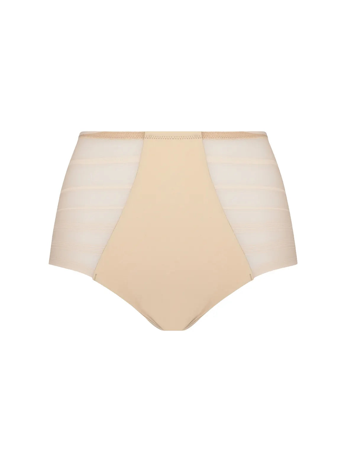 High-waisted knit brief with raw edge. Center front in knit, side and back in raw edge with stripes. The thighs in front are in a sheath. The thighs on the sides and back are in raw edge. The center front is doubled. An elastic underlines the waist.
