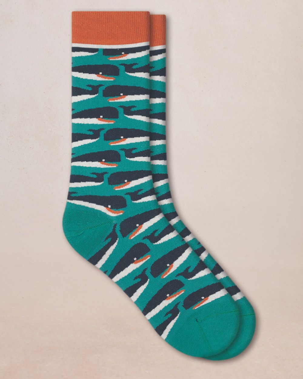 Majestic and mysterious, sperm whales feature on the design of these socks. A tribute to the depths of the sea and the quiet strength of the giants of the ocean, knitted in soft, cosy cotton.