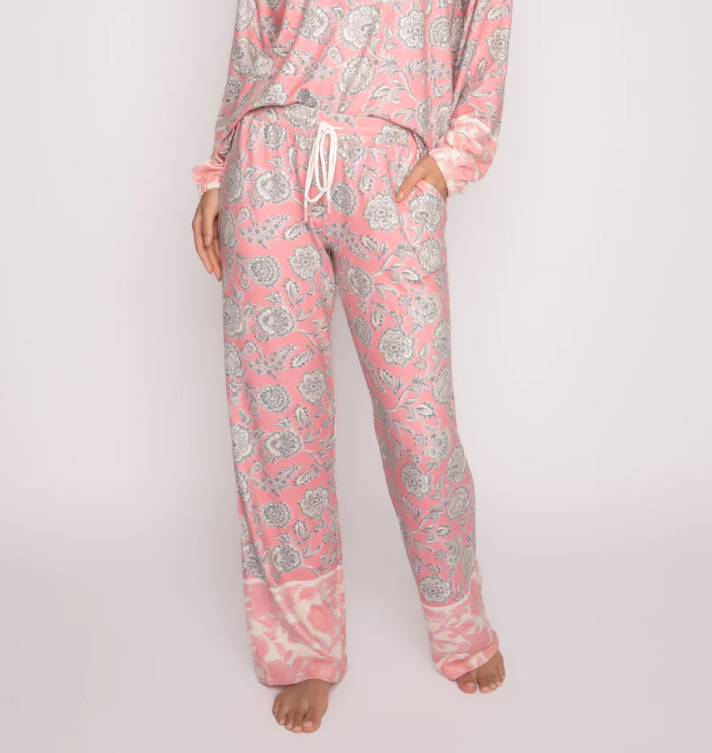 You're no wallflower in this boho-print lounge pants. A lush pink floral tapestry printed pj pant with border print at cuffs. An amazing statement look when you want to stay totally comfy. Model is 5'8 1/2", wearing size small.