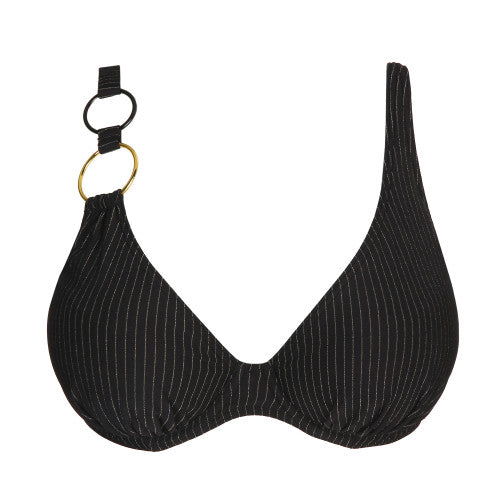 Elegant, deep plunge bikini top with half-padded cups with glitter stripes. The shoulder straps are asymmetric and one of them features two rings. For an on-trend look, match with the 90’s style bikini briefs that sit extra high on the buttocks. Timeless black with a golden shimmer that catches the light. Chic and sophisticated!