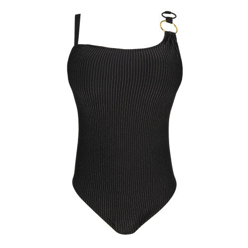 Stylish swimsuit with glitter stripes, an extra low back, and high-cut legs. You can wear it with one or two straps. Sexy and stylish! Timeless black with a golden shimmer that catches the light. Chic and sophisticated!
