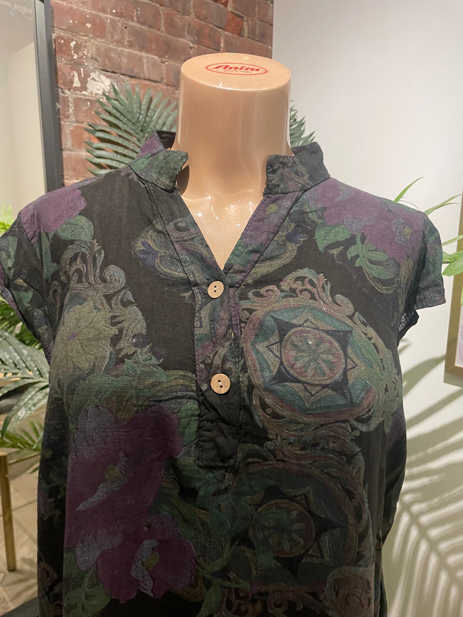 GM30383-Plum Loco 100% Linen Cap sleeve Mandela Flower Print