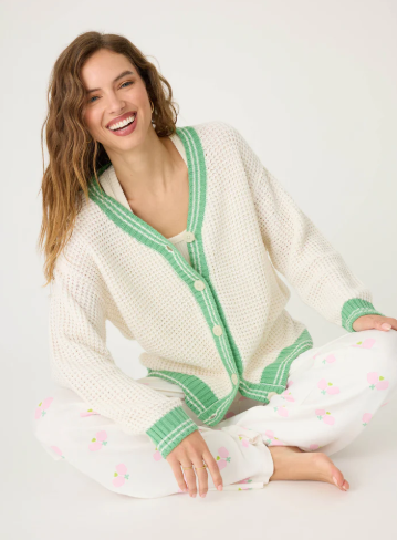 Women's ivory textured knit cardigan with green stripes, button-front closure, and two front patch pockets.
