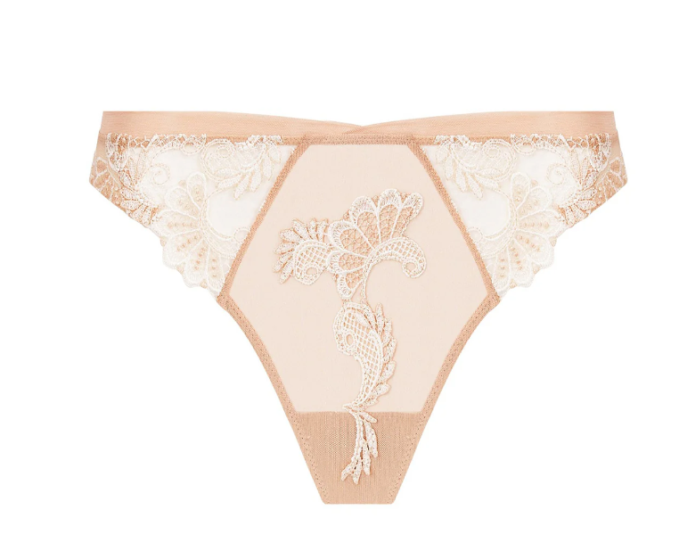 - Design: Embroidered tulle thong panty. Sheer fabric throughout.