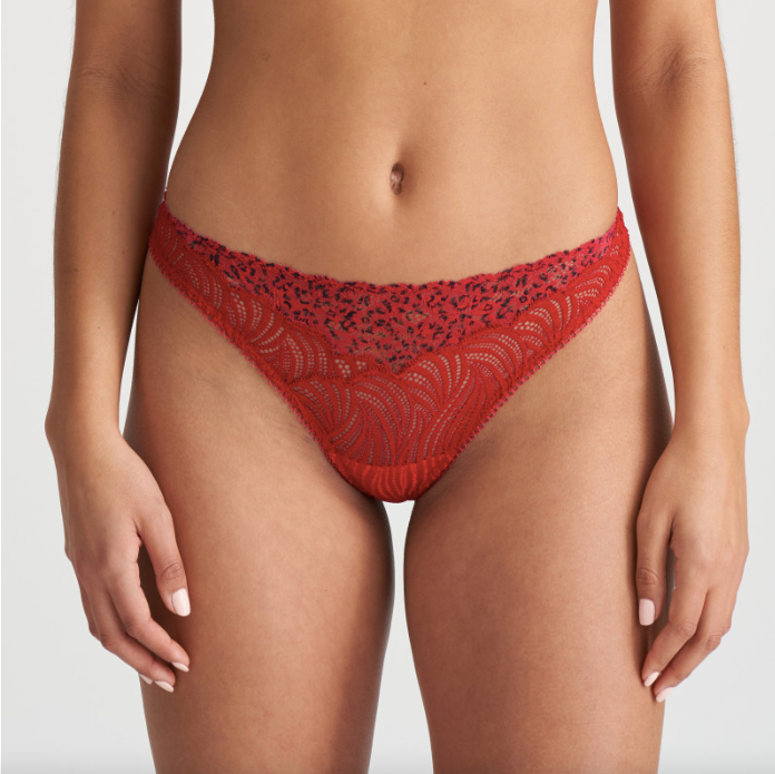 Gorgeous thong with graphic lace and a flirty animal print. Produced with 50% of recycled yarns. Strawberry Kiss is an irresistible red statement color.