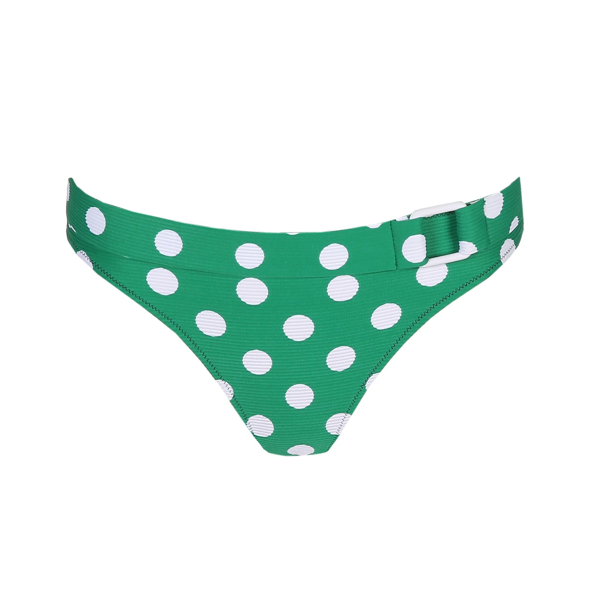 Bikini briefs with a vibrant print and belt at the waist. Extremely feminine and sophisticated! Playful white polka dots against a deep green background: discover the retro charm of Kelly Green!