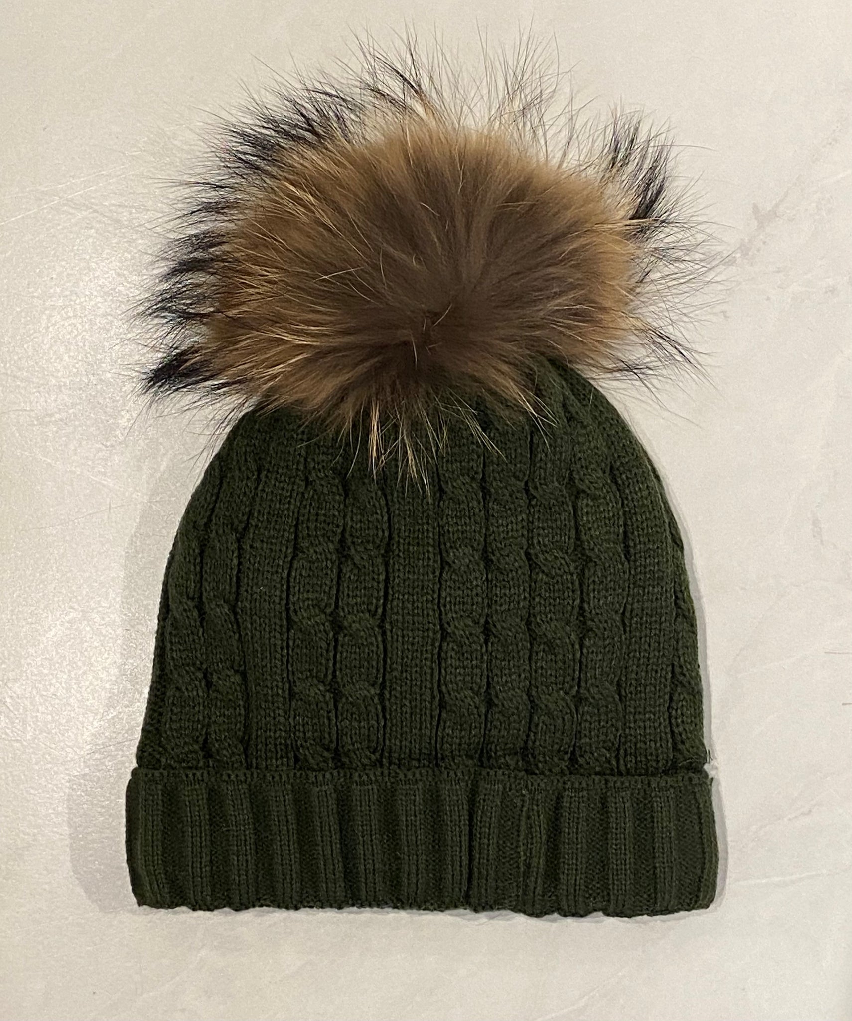 Classic style and cozy comfort, the Mitchies Matchies knitted with real recycled fur pom hat has a bit of added luxury. The timeless cable knit and wide cuffed brim is a most-desired eternal look, Topped off with a soft real fur pom-pom.