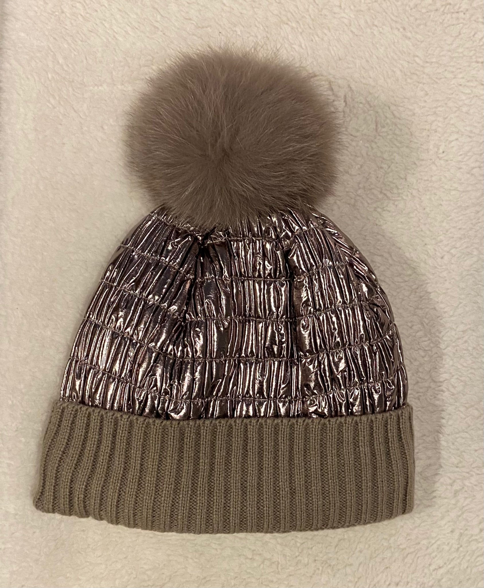 Mitchie's Knitted Hat with Nylon Quilting and Fox Fur Pom Pom