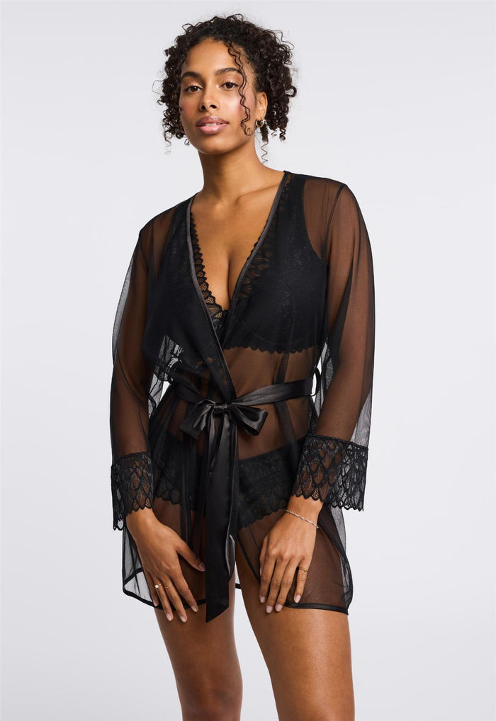 Ideal for lounging and getting ready in full glamour. This stunning mesh cover-up will elevate any lingerie set you choose to wear underneath. Features: • Ultra-soft sheer mesh • Rounded bottom hem • Lace trimmed sleeves • Removable satin belt • Ethically made Washing Instructions: • Hand wash, cold water OR machine wash closed in mesh bag, gentle cycle • Hang to dry Style #9341