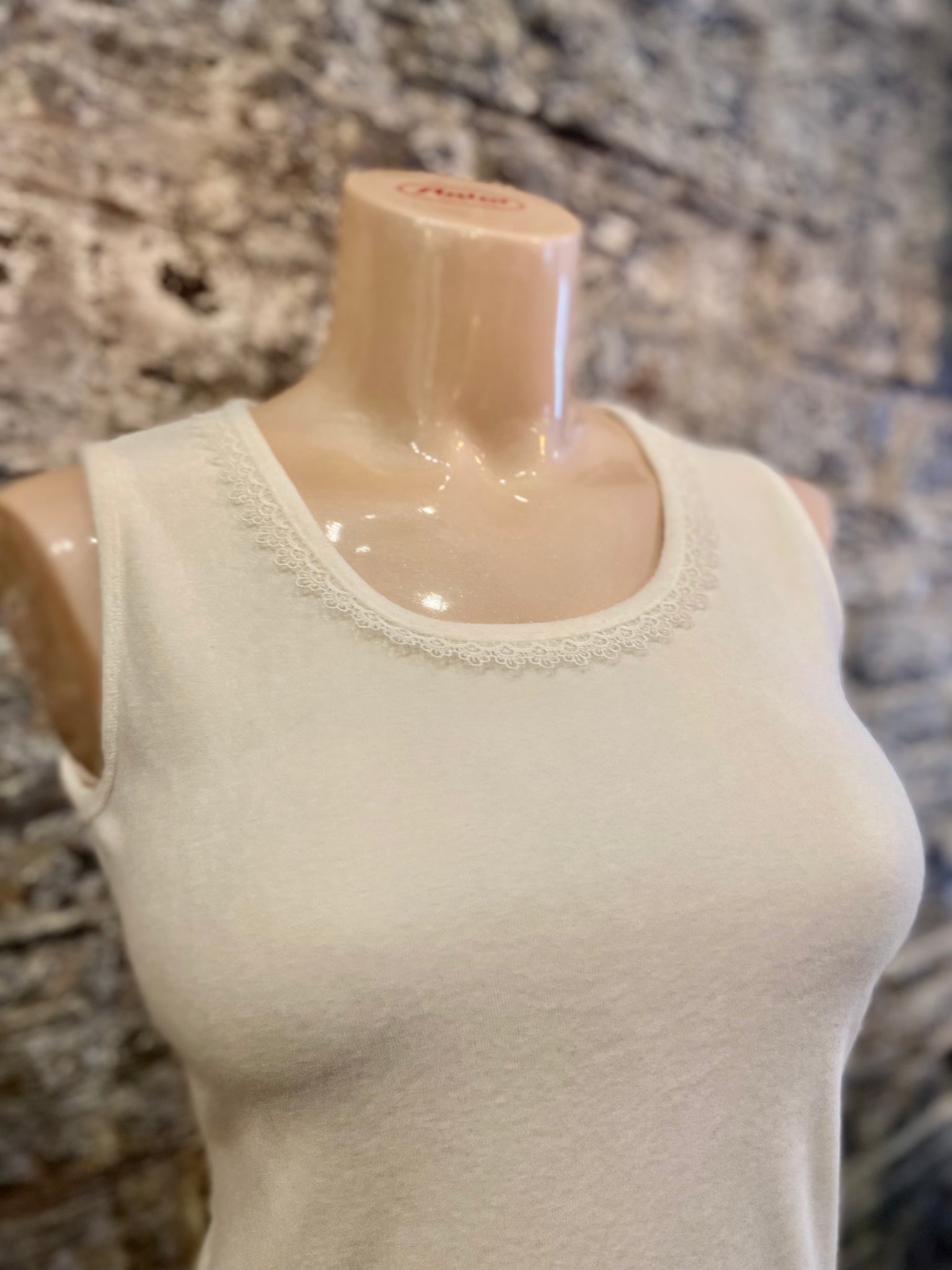 Classic line white full-length night dress completed with a sleeveless design and chic lace detailing around the neckline. Matches perfectly with the Najerika Bamboo Robe.