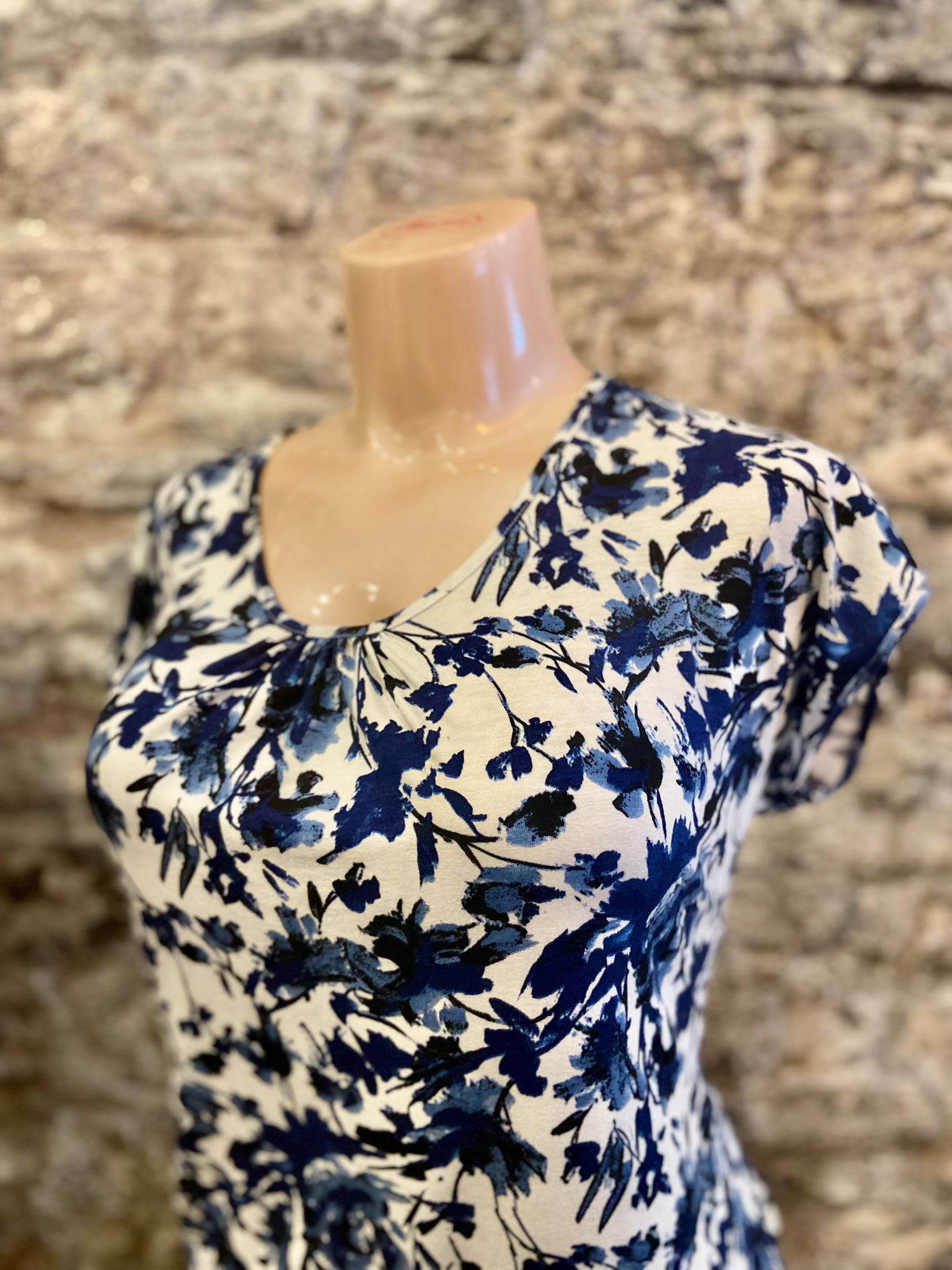 White and cobalt blue floral patten with classic design and silhouette. The night dress is designed with princess cut sleeves and even includes pockets. Matches perfectly with the Najerika Flora Robe.