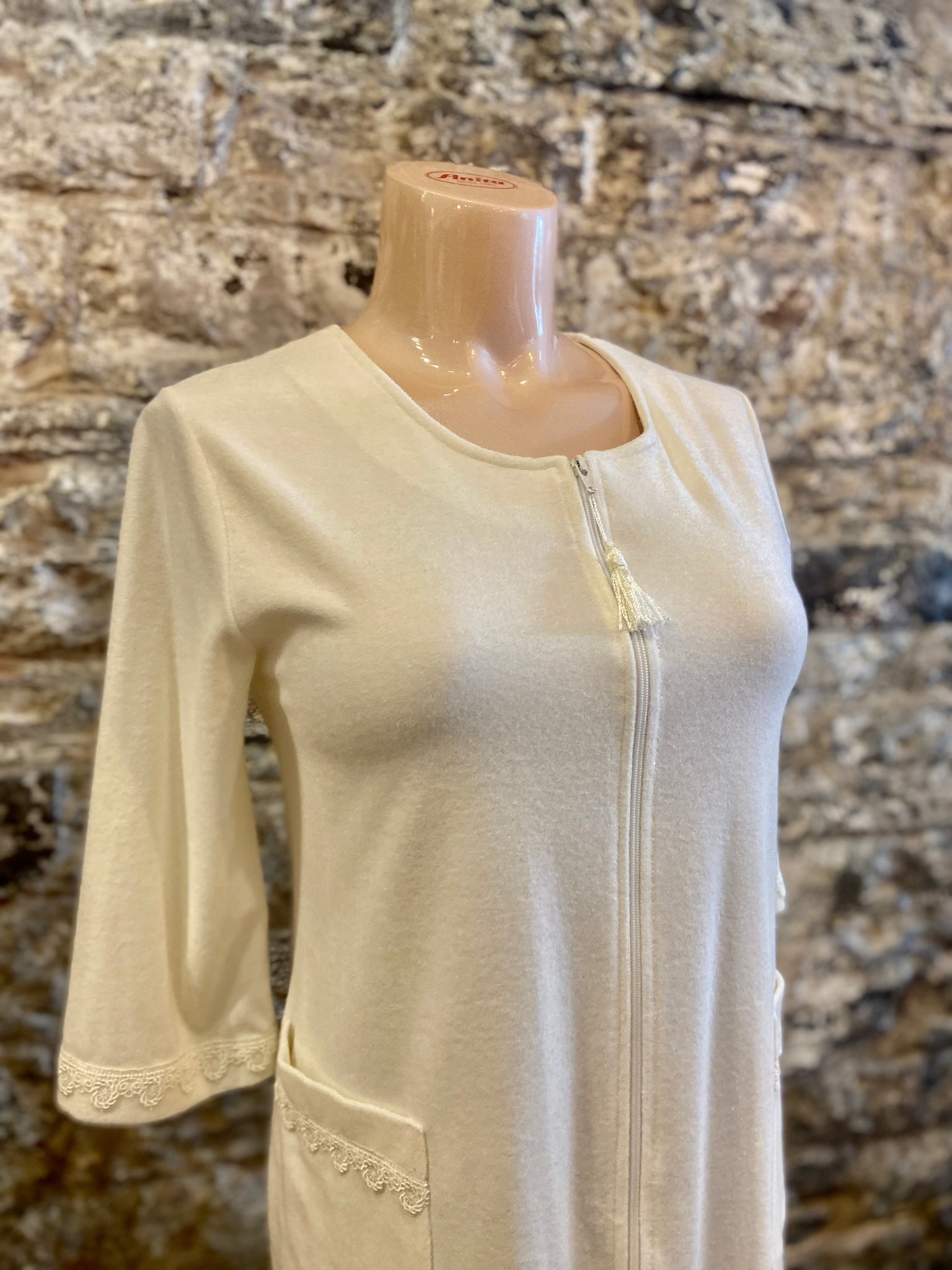 Classic linen white, shin-length nightdress. Fitted with a zipper down the centre and a tassel detail. Completed with pockets trimmed with lace and quarter length sleeves. Matches perfectly with the Najerika Bamboo Robe.