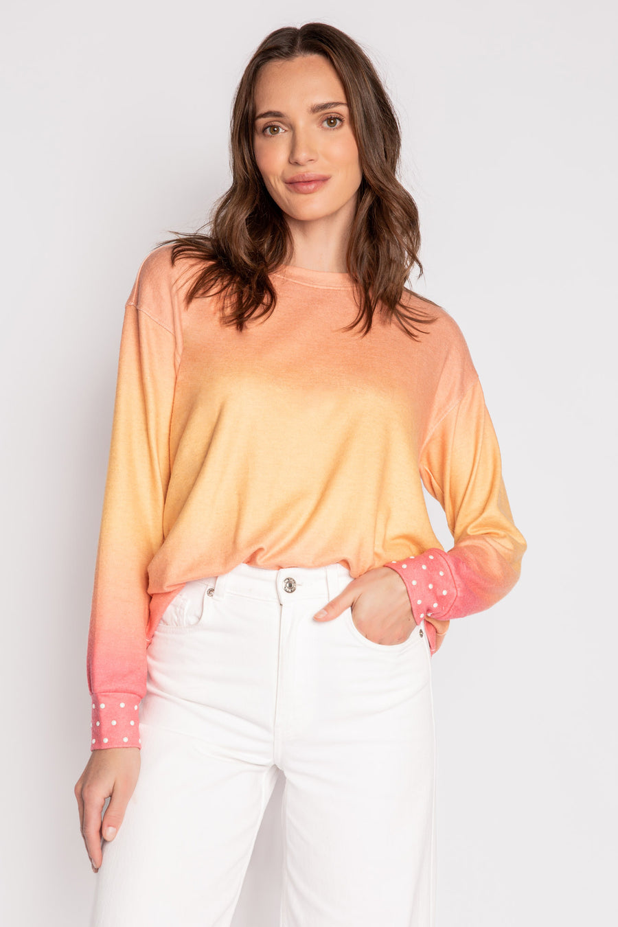 Long Sleeve Top: For anyone who loves a blazing, fiery sunset - this soft lounge top delivers. Ombre peach-coral dyed top with pearl-nailheads at cuffs. Model is 5' 10", wearing size small.