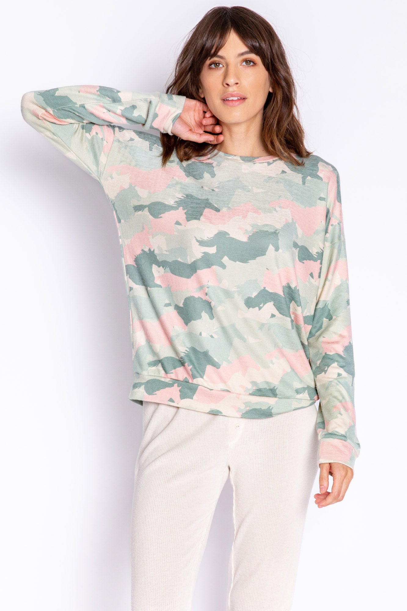 DESCRIPTION: Head-to-toe-in horses. Subtle, muted camo in a hidden horse pattern. One of our favorite spins on a classic print this season - with a relaxed lounge top.