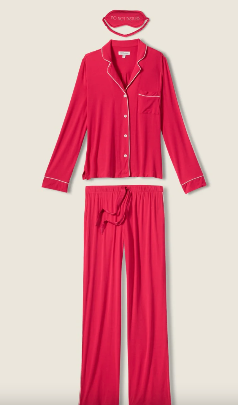 Brighten up your loungewear collection with this bold ruby red collared PJ top and matching tie-waist pants, complete with an embroidered 'do no disturb eye mask' sleep eye mask for added luxury. The vibrant color and comfortable fit make this set a standout for lounging or relaxing in style.