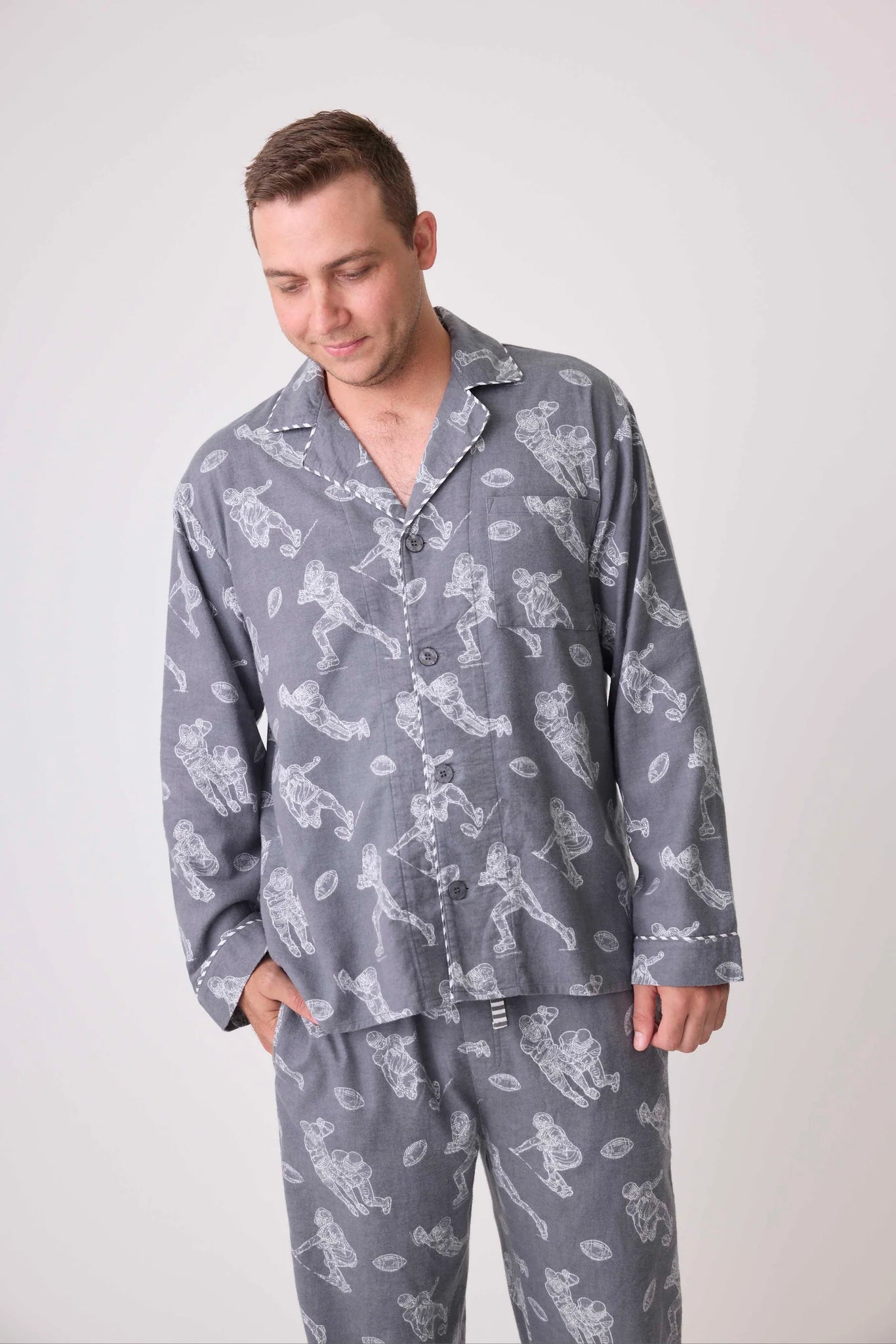 Men's cotton twill flannel pajama set with grey & ivory football print