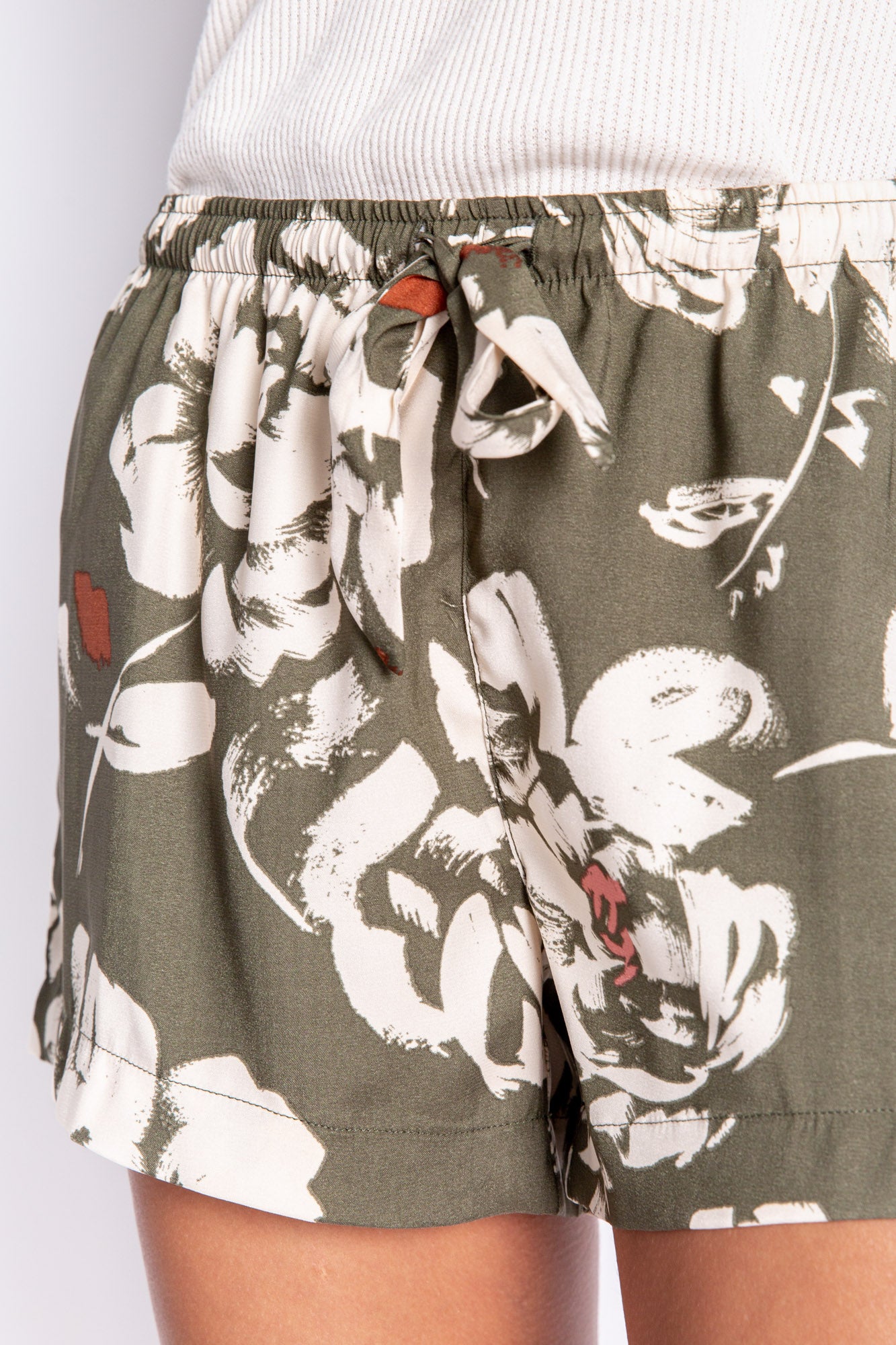 DESCRIPTION: A rich floral sleep short, in a luxe woven with a satin feel on the inside.