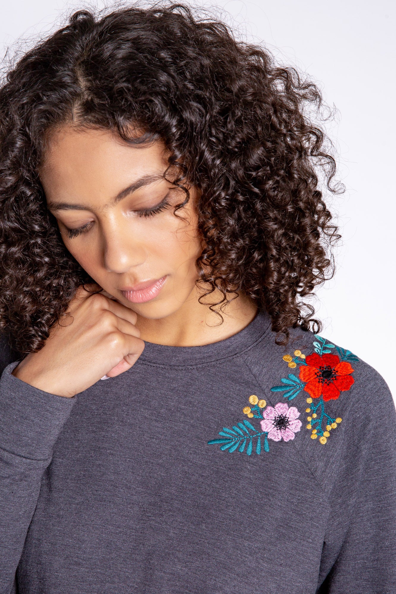 DESCRIPTION: Summer-perfect terry lounge top with the sweetest floral embroidery. Features multi-colored embroidery on the shoulder.