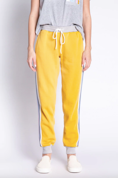 DESCRIPTION: Win gold in a modern-meets-retro striped jogger. Sides with multi-striped knit taping, and sporty striped cuffs. Everyday-ready with side pockets and back patch pocket.
