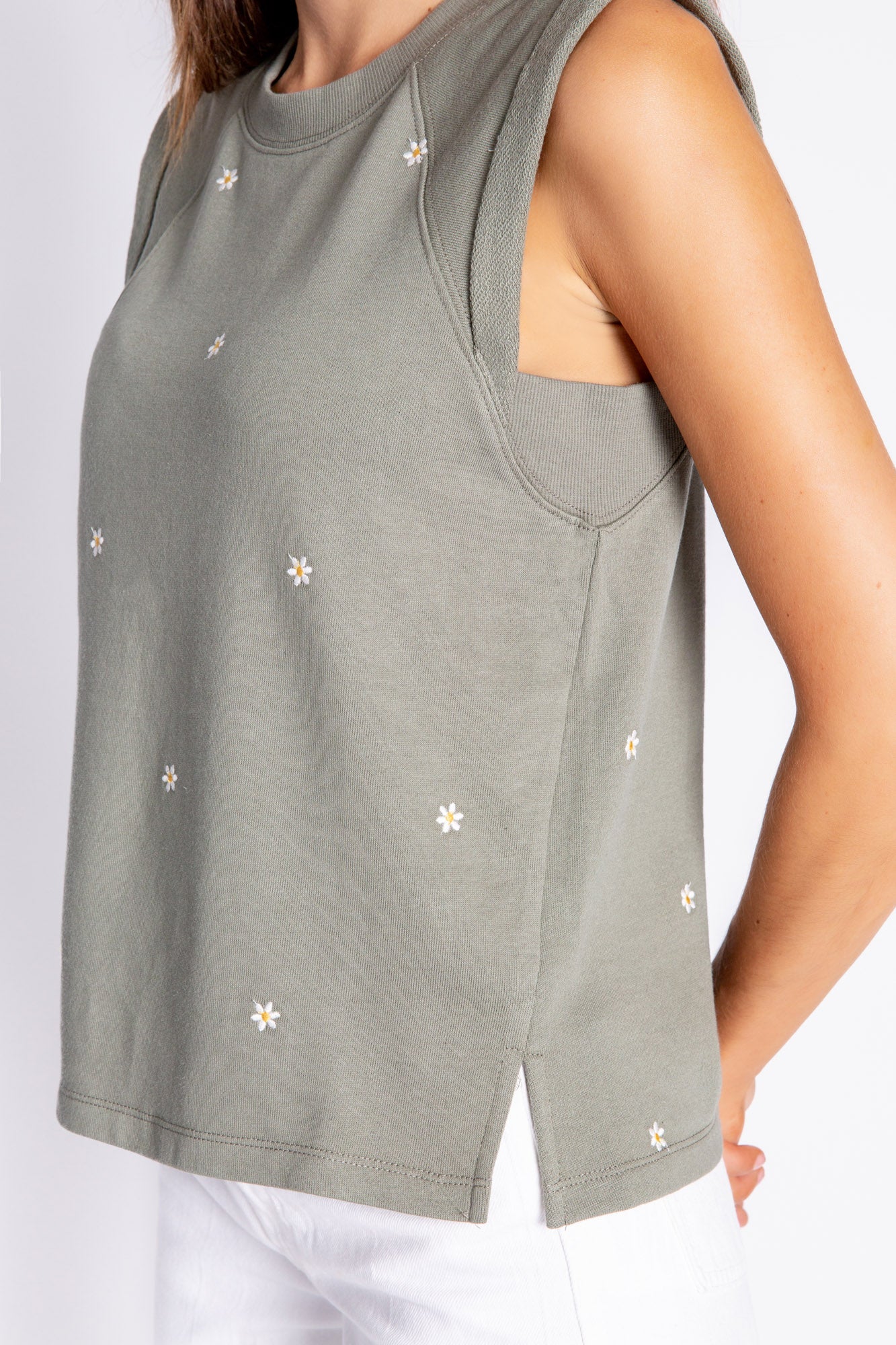 DESCRIPTION: You will love this Happy Vibes Tank from PJ Salvage! The tank top shape is perfect - with armholes cut just right, with turn-back detail, and side slits to tuck in or wear out. A perfect warm-weather tank in cotton-blend with mini floral embroidery.
