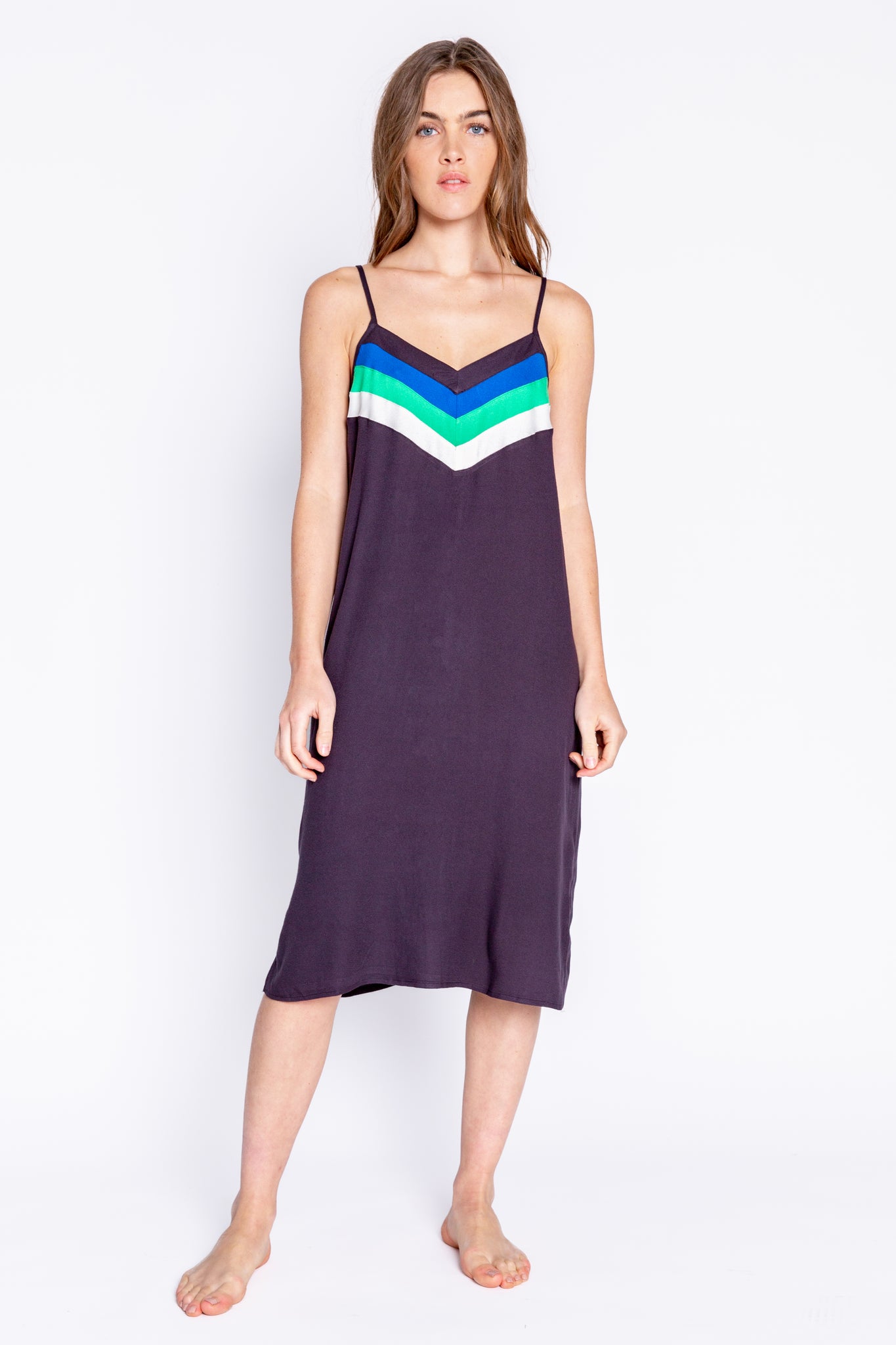 DESCRIPTION: Relaxed fit, dark slate chemise in woven matte sateen. Double layer front bodice for wear ability, and narrow straps are adjustable for fit. This style was made in a *Women Empowered Factory (*At least 51 percent owned, controlled, or managed by a woman or women.)