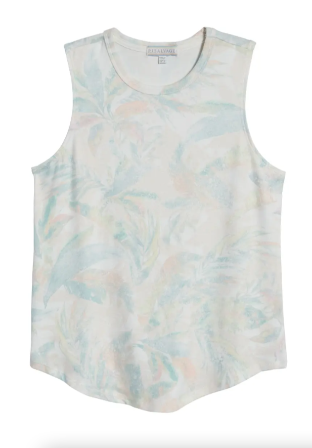 DESCRIPTION: Palm fronds with a sun-faded look detail a soft and fuzzy tank that will put you in relaxed mode the moment you slip it on.