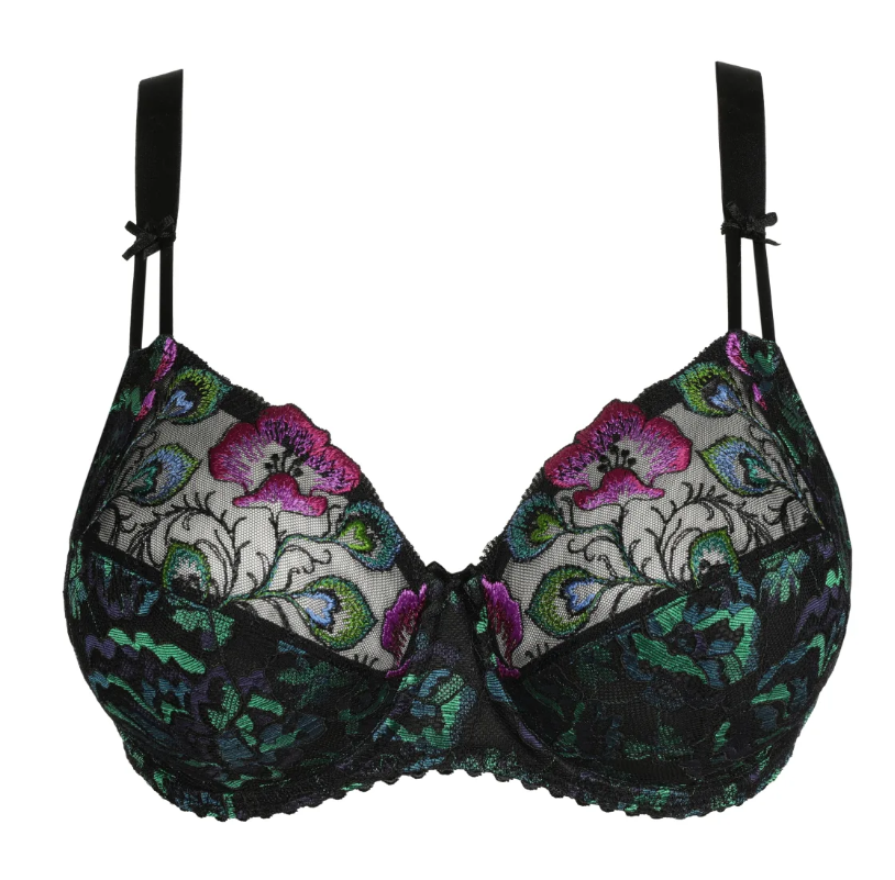 Full cup underwired bra with a sturdy double lining. This bra fully encloses the breasts. Peacock Feather is a blend of vivid colors. Warm fuchsia and intense shades of blue and green create a stunning contrast against a black background.