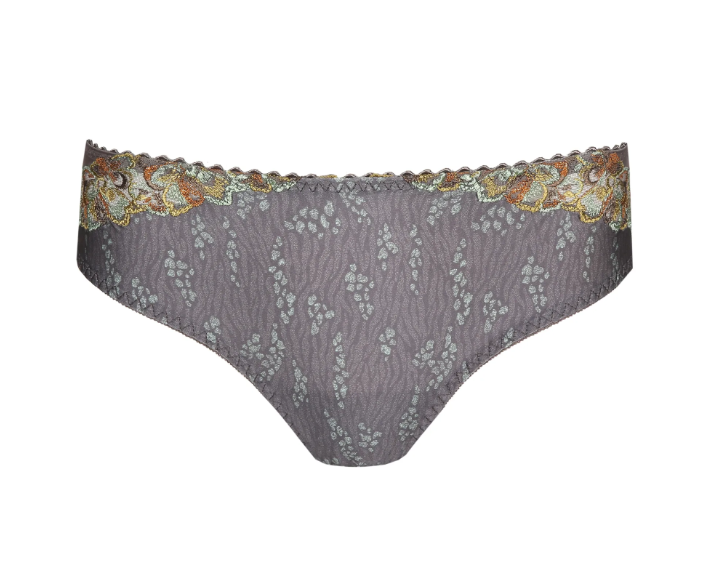 Hotpants made from a shimmery floral-print fabric with feminine embroidery at the back. Kitten Grey is a flattering mix of khaki and taupe with copper and mint accents.