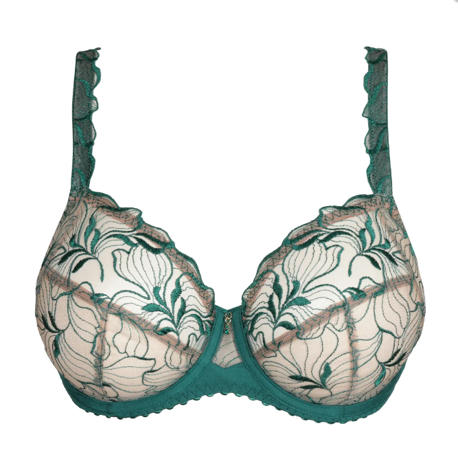 Full cup underwired bra with a sturdy double lining. This bra fully encloses the breasts. Jasper Green is an elegant pattern featuring emerald green embroidery against a lighter background for an artistic tattoo effect.