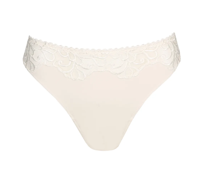 Thong in a soft, printed fabric with delicate embroidery on the legs. The feminine, natural color blends with your skin and is perfect under your light-colored summer outfits. Pure elegance!