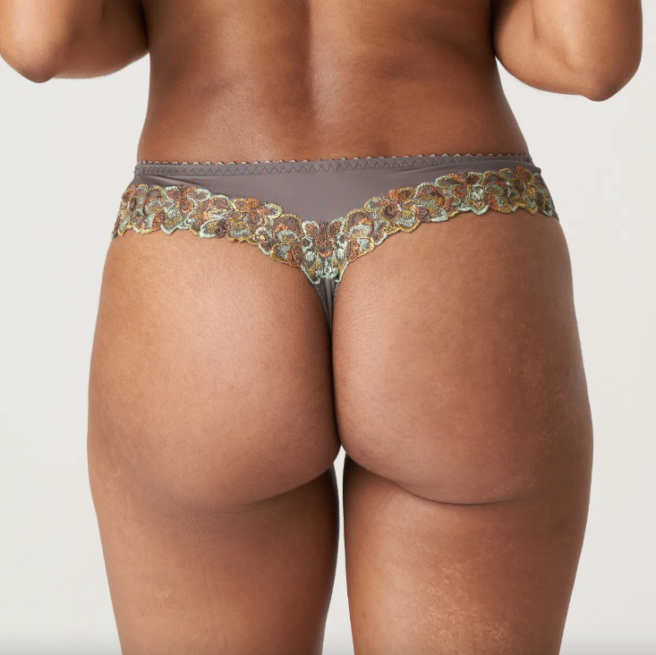 Colorful thong made from a chic, shimmery fabric with an opulent floral print. Kitten Grey is a flattering mix of khaki and taupe with copper and mint accents.