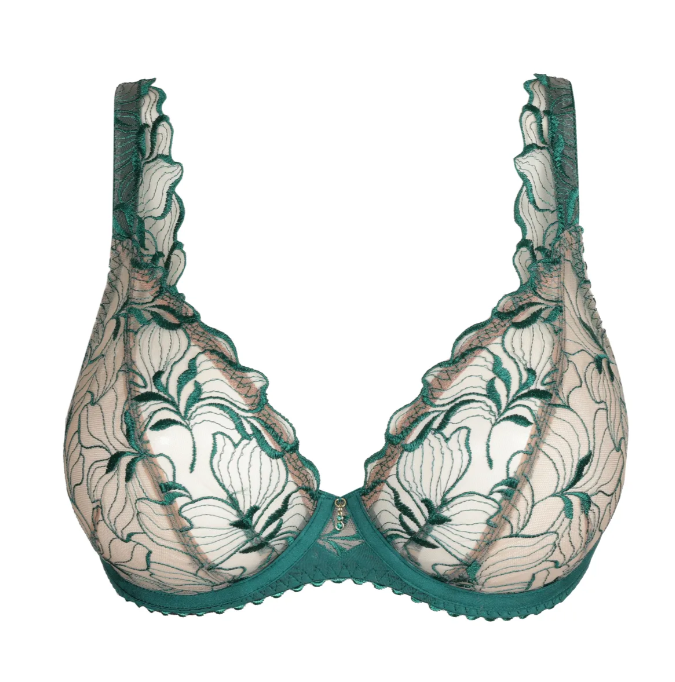 Plunge bra with low-cut, padded cups lined in sturdy tulle. Jasper Green is an elegant pattern featuring emerald green embroidery against a lighter background for an artistic tattoo effect.