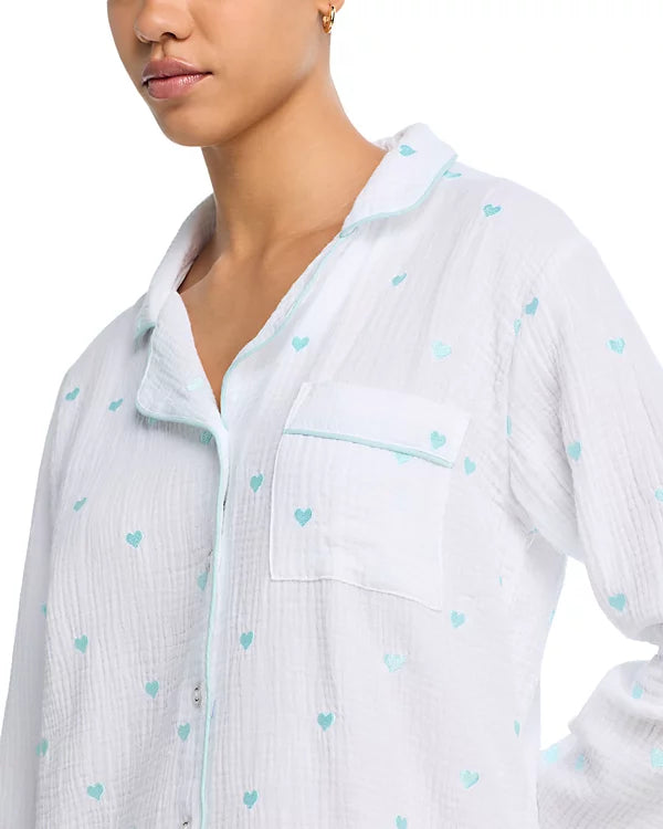 Indulge in a luxurious night's sleep with the Lottie Love Short Set, where comfort meets REM. Crafted from 100% cotton, this sleep set envelops you in softness, ensuring a serene slumber. Adorned with custom embroidered hearts, its sophisticated notch collar and button-down design exude timeless charm, while the chest pocket and delicate piping trim add a refined finish.